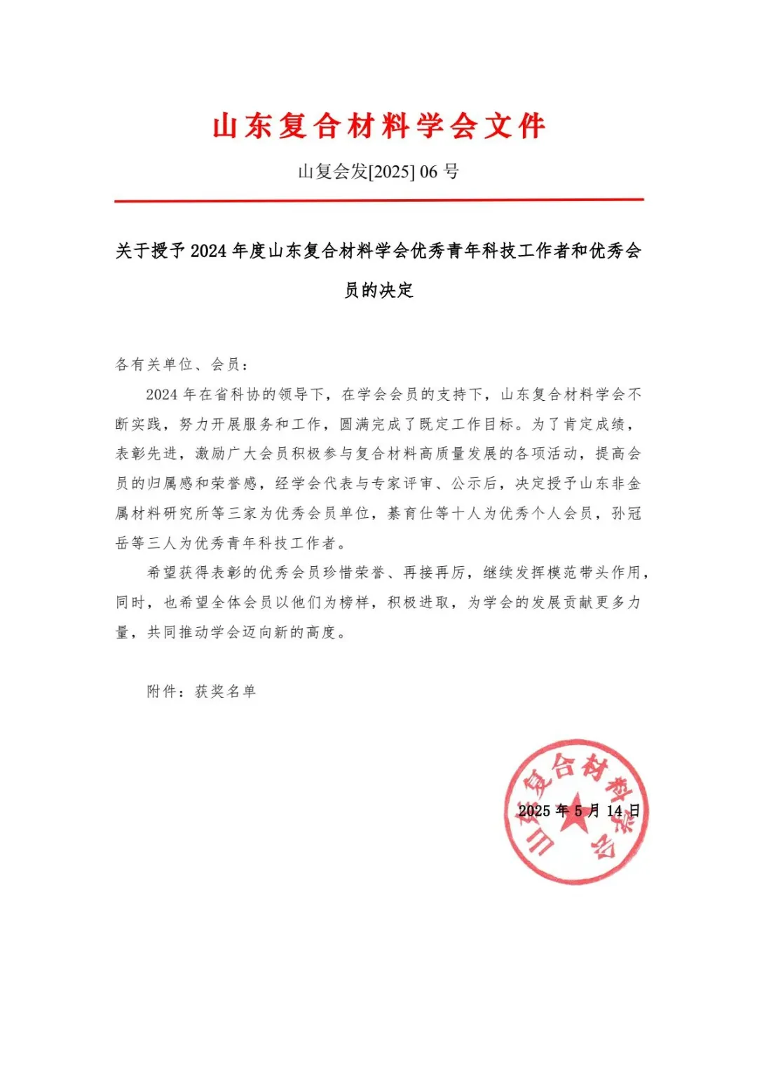 【学会通知】关于授予2024年度山东复合材料学会优秀青年科技工作者和优秀会员的决定